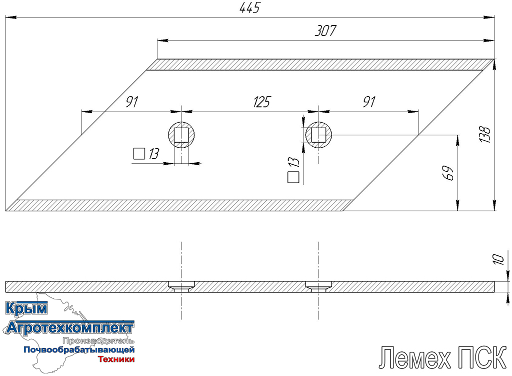 При производстве Лемехов выдерживается полный технологический процесс. Лемех ПЛН изготовлен из стали марки 65 Г, толшиной 10 мм. Термический обработан (закалка на масле - отпуск).
